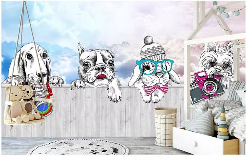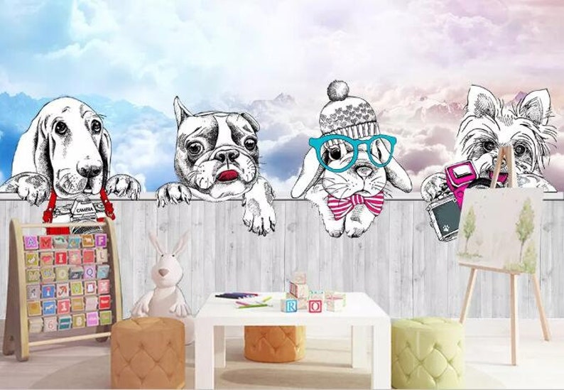 Simple Hand Painted Cartoon Lovely Dogs And Rabbit Nursery