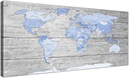 Large Blue Grey Map Of World Atlas Canvas Wall Art Print 120cm