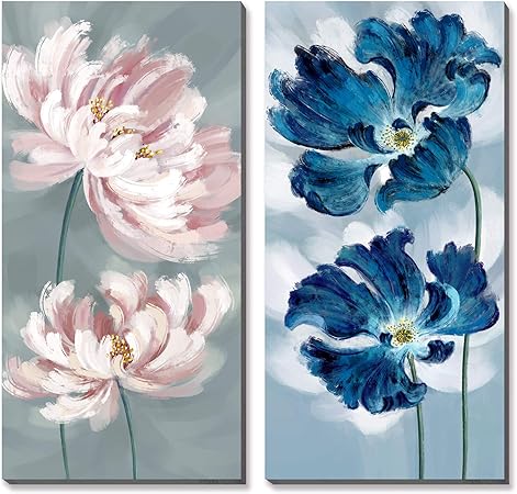Wesiator Flower Canvas Wall Art Navy Blue Pink Floral Painting