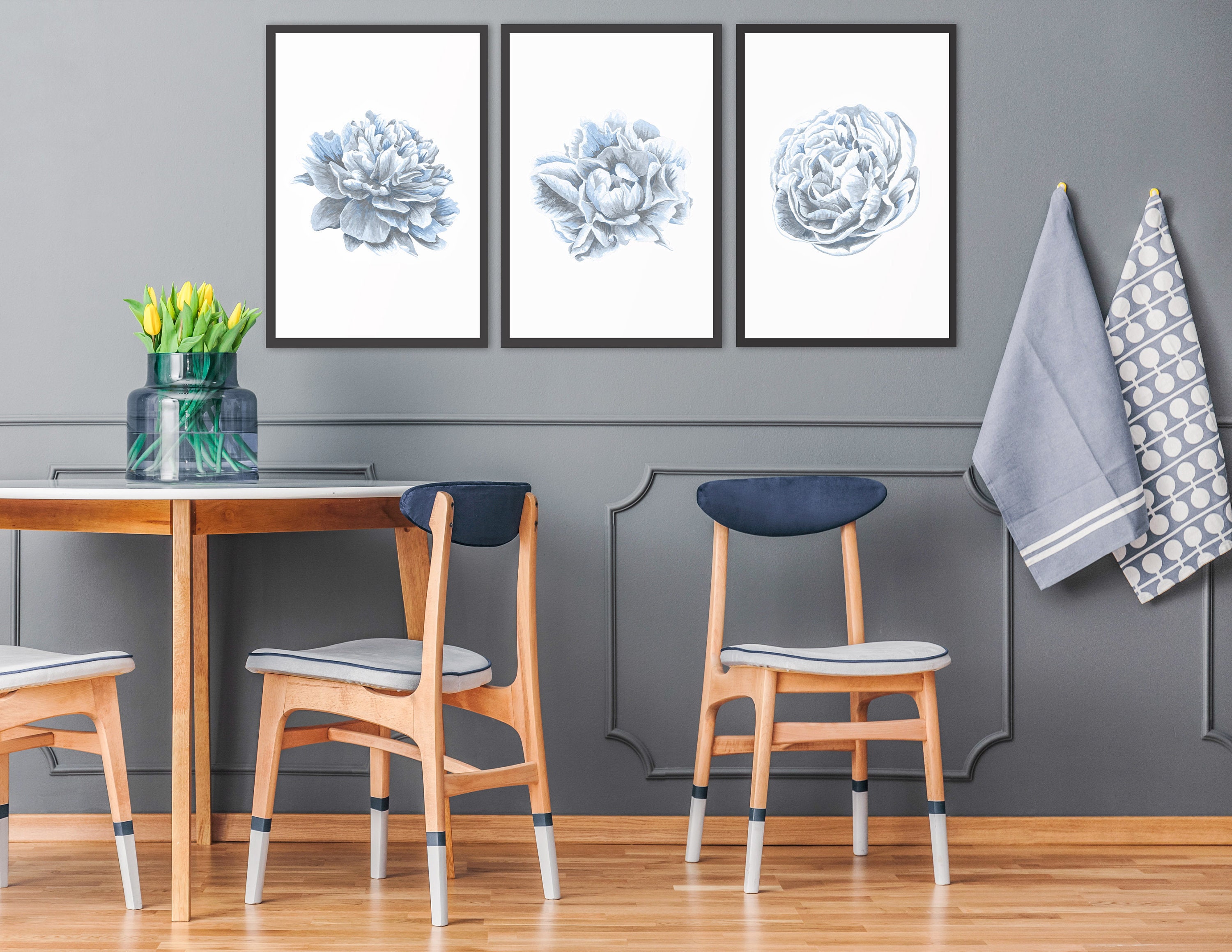 Watercolor Peony Large Navy Blue And Gray Wall Art Prints Set Of 3 Ready To Hang Canvas Wall Art With Or Without