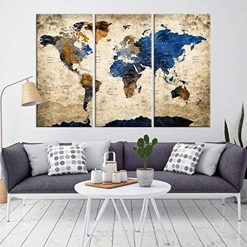 Amazon Com 3pc Watercolor Navy Blue Abstract Wall Art World Map Push Pin Large Canvas Print Wall Art Map For