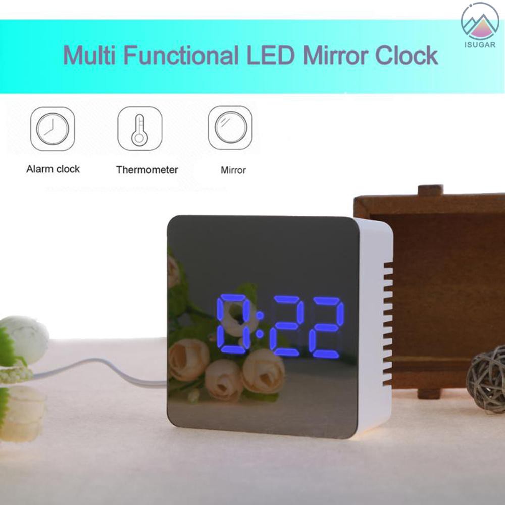 Mirror Glass Alarm Clock Blue Led Night Light Thermometer Digital