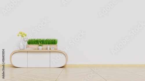 Living Room Interior With Plants Cabinet On Empty White Wall