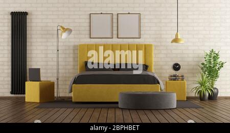 Black And Yellow Master Bedroom With Double Bed Against Brick Wall