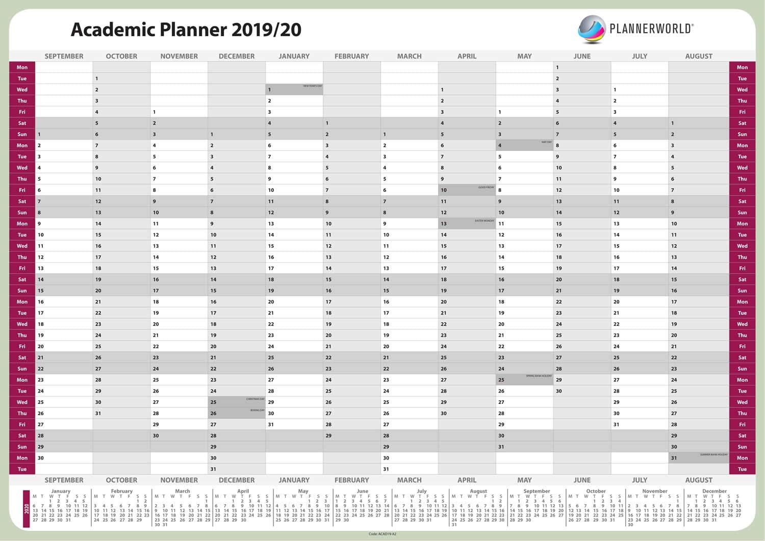 A1 2019 2020 Unmounted Academic Mid Year Wall Planner School