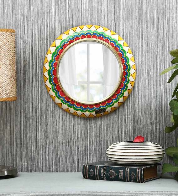 Buy Wooden Round Wall Mirror In Yellow Colour By D Dass Online
