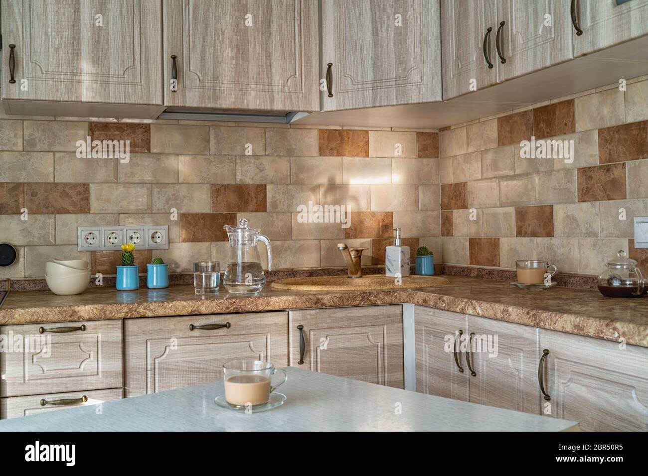 Modern Kitchen Interior With Wall Cabinets Work Desks And Sink