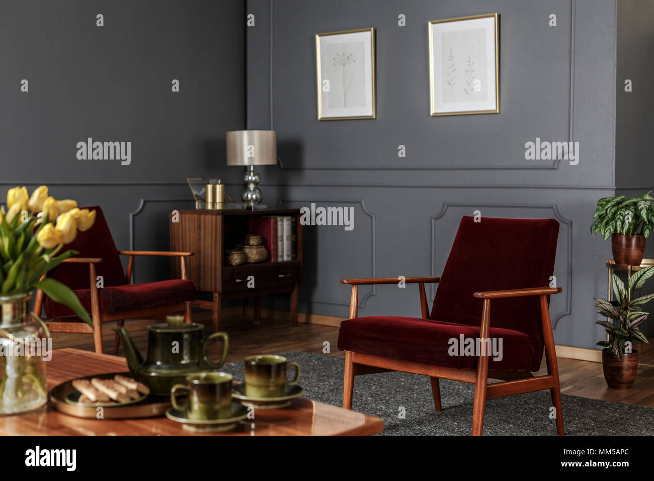 Posters On Grey Wall With Molding In Living Room Interior With Red