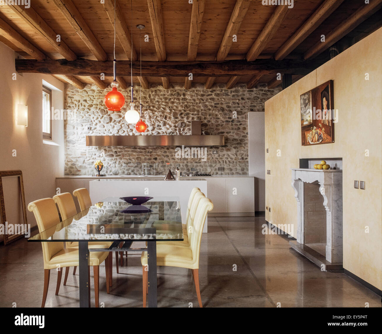 Modern Picture Above Black Marble Fireplace In Modern Dining Room