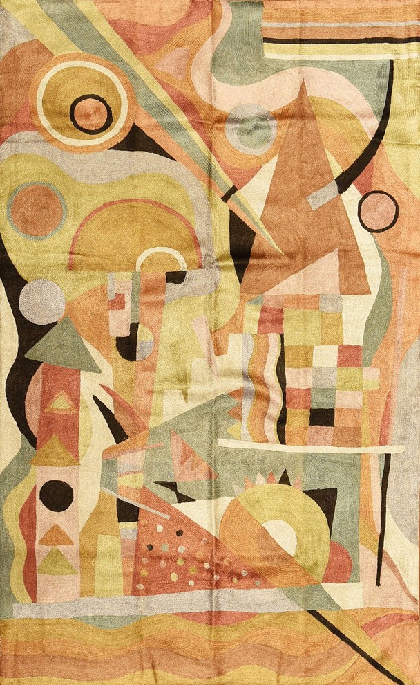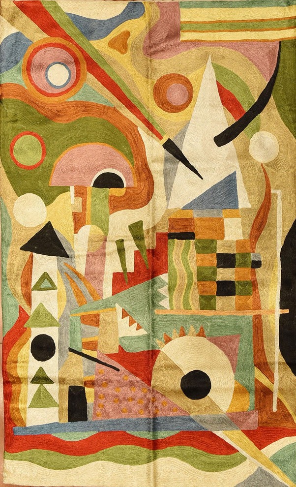 Kandinsky Colorful Abstract Composition Silk Modern Rug Wall Hanging Tapestry Hand Embroidered 2ft X 3ft Designer Kashmir