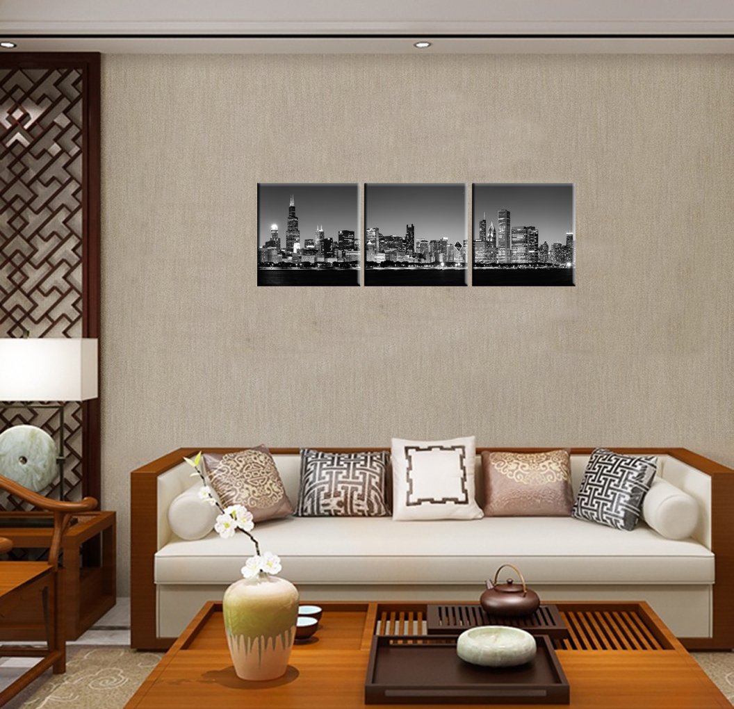 Black Youk Art Canvas Print Modern Wall Art Picture For Home Decor Bathroom Living Room Bedroom Black White Chicago Skyline Night Buildings Cityscape Coastline 3 Pieces Paintings Framed Artwork
