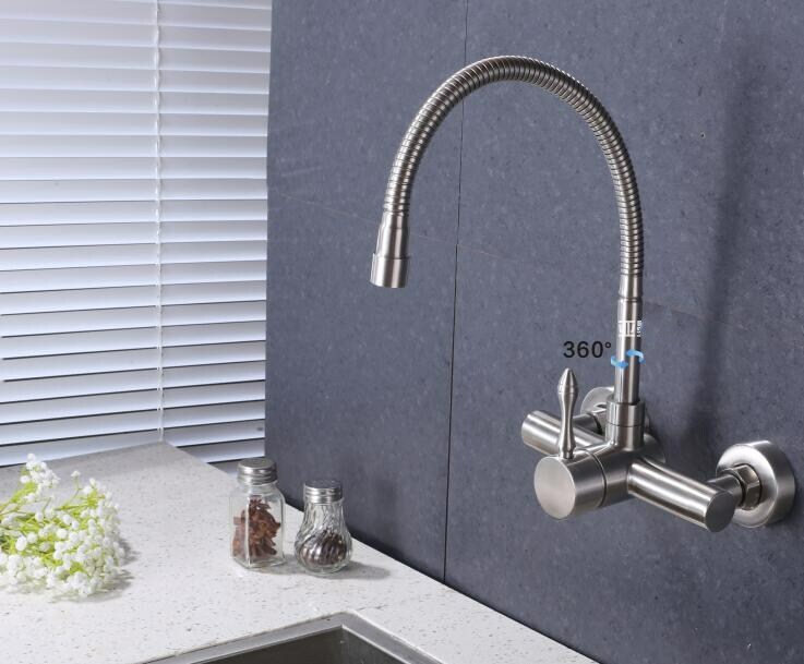Wall Mount Modern Dual Handles Kitchen Faucet Sink Brushed Sus 304
