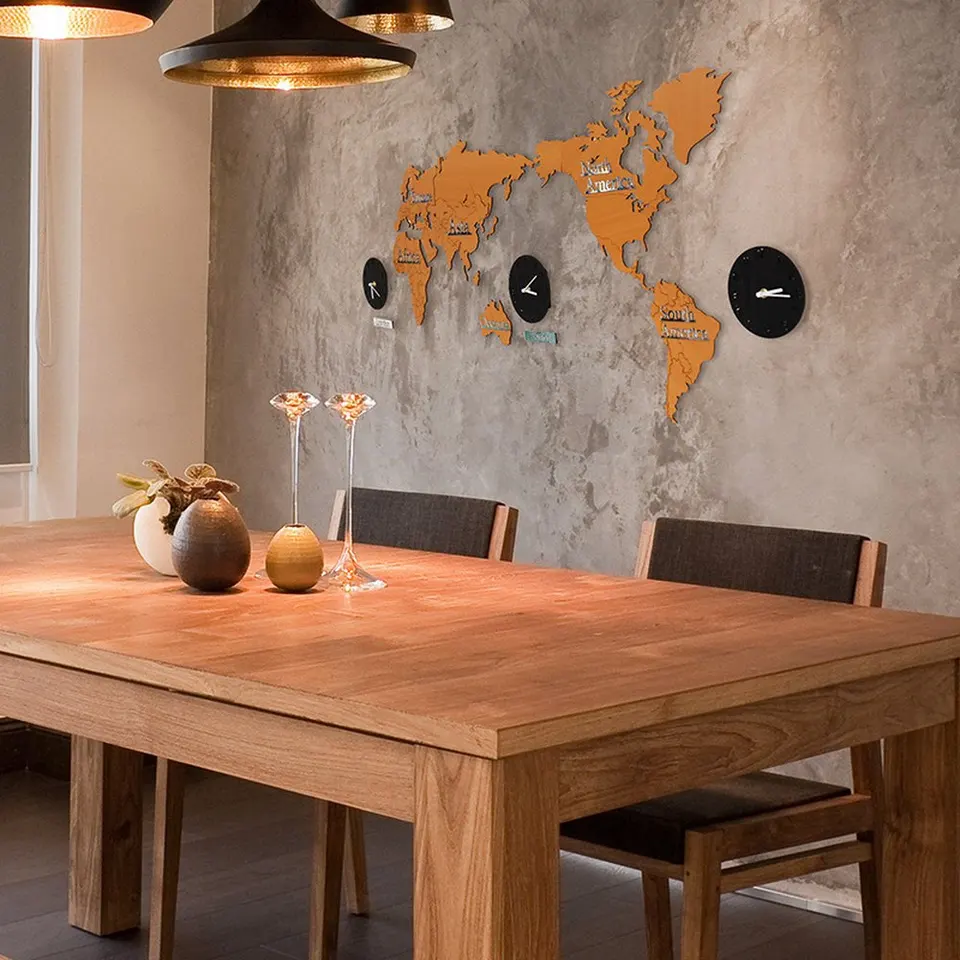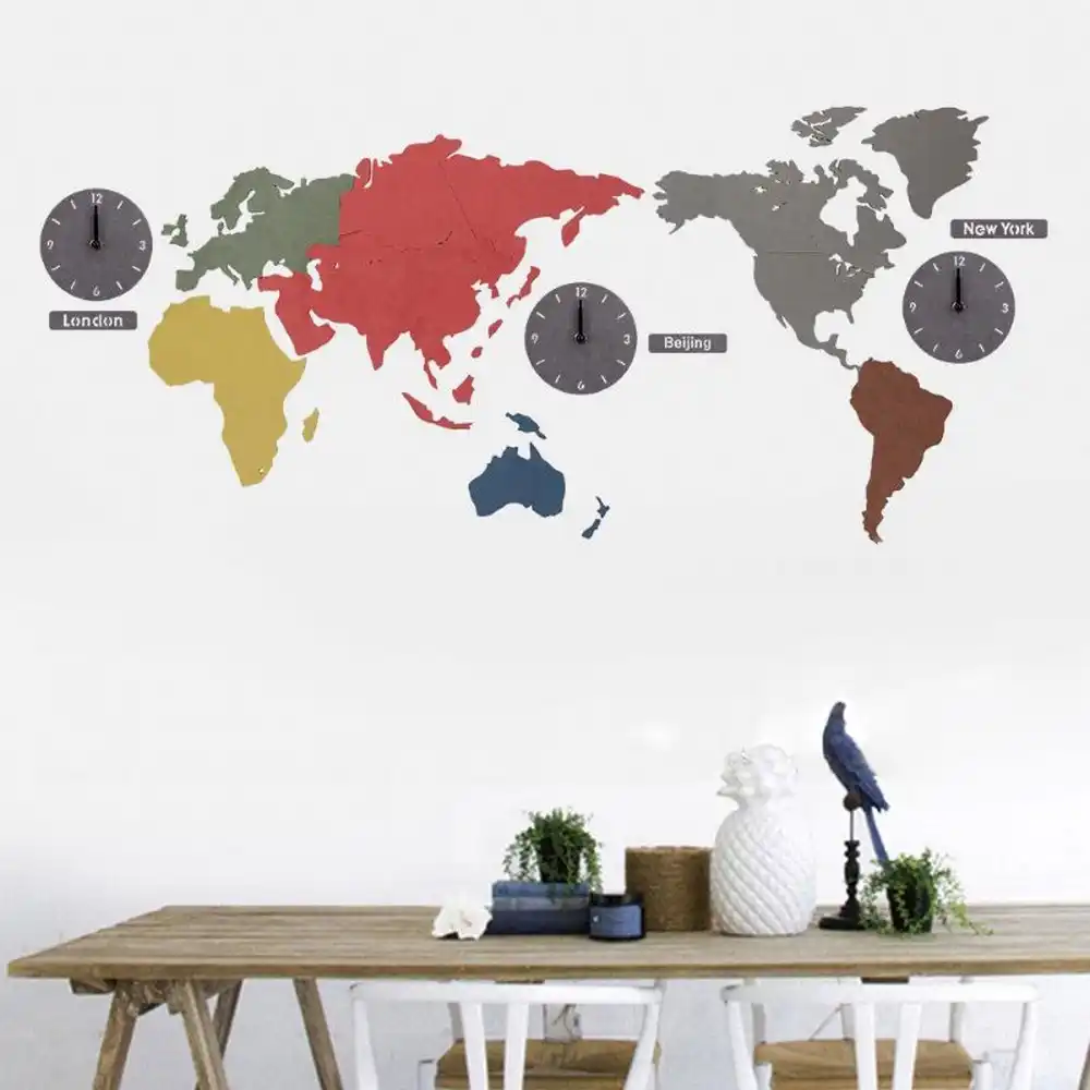 Multi Time Zone Wall Clock Color Wooden Printing Silent Quartz