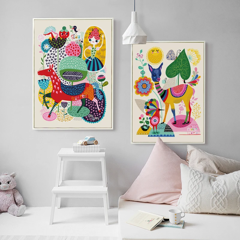 Elegant Poetry Simple Cartoon Animals Colorful World Canvas