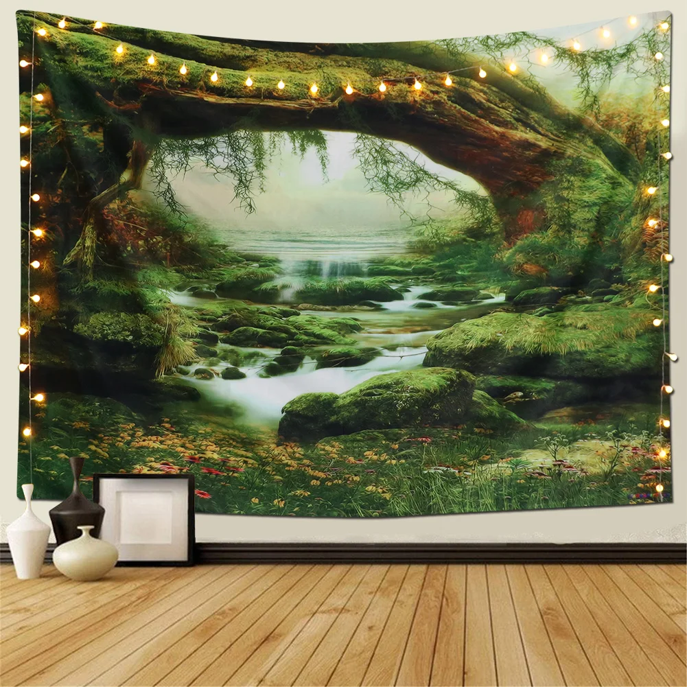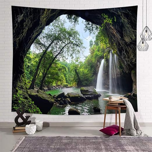 Sevendec Cave Tapestry Wall Hanging Forest Stone Waterfall Green