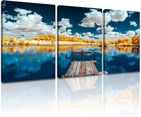 Amazon Com 3 Panels Navy Blue Lake View Picture Prints On Canvas Autumn Scenery Wall Painting Landscape Canvas Wall Art For Living Room Strecthed And Framed Ready To Hang 12 X16 X3pcs Posters Prints