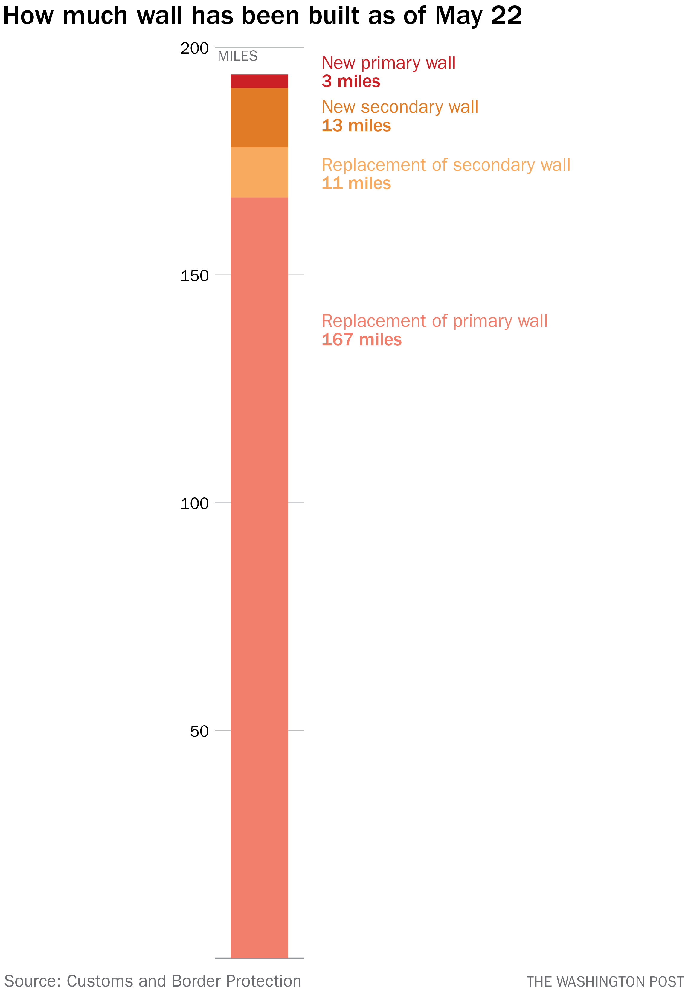 As of late june 216 miles of new primary and secondary border wall have been built since january 2017.