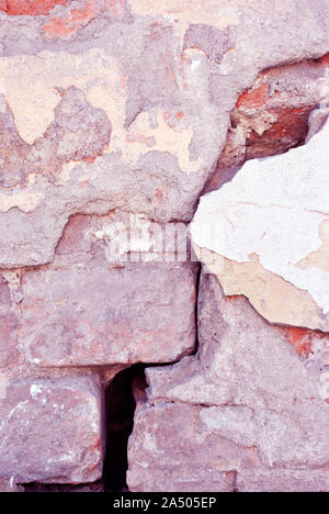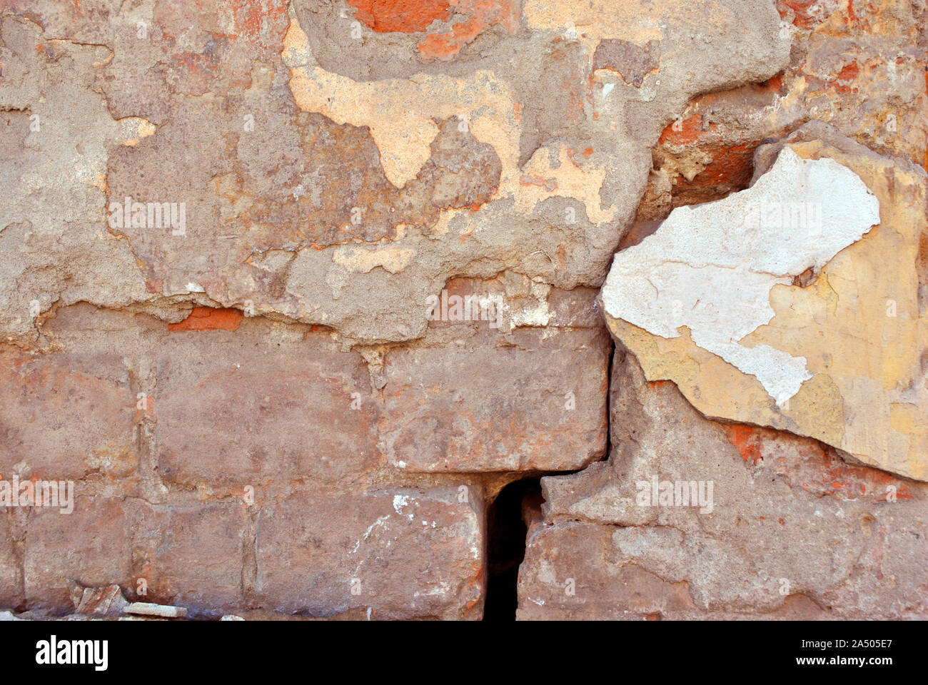 Cracked Paint Plaster Of Soft Yellow Red Pastel Color On Brick