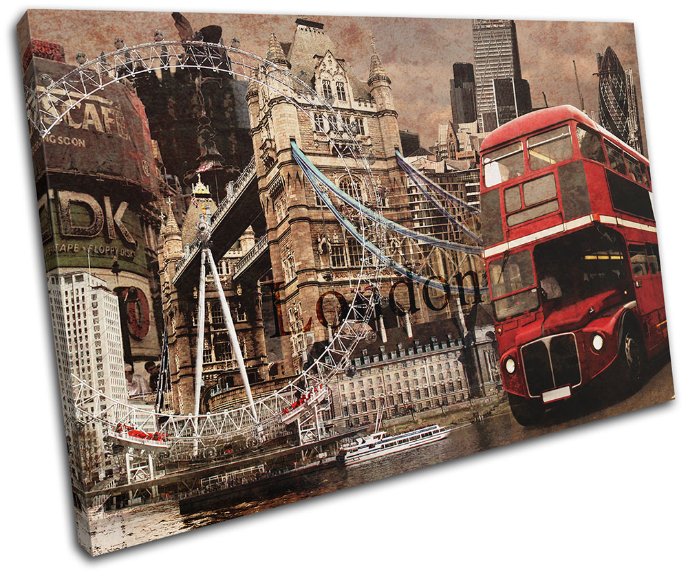 London Red Bus Vintage Collage City Single Canvas Wall Art Picture