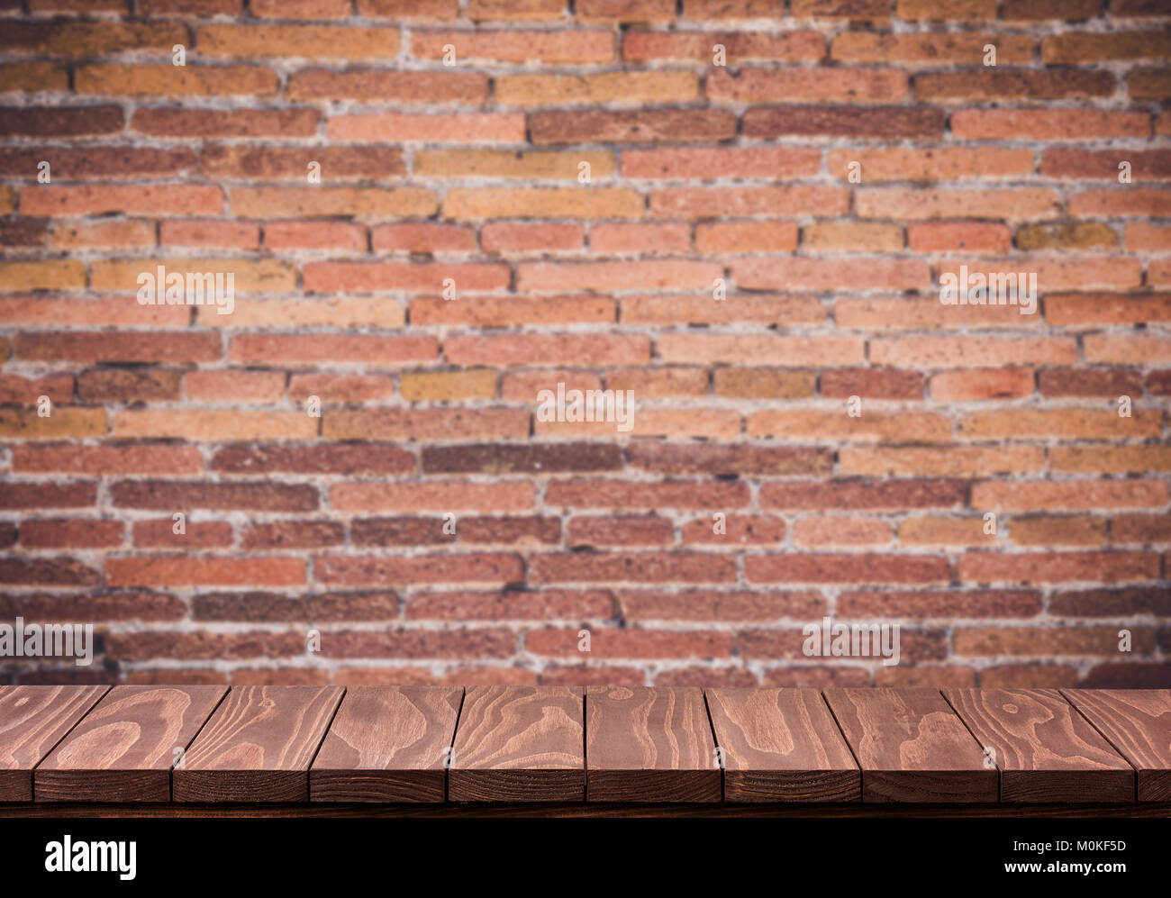 Wood Table In Front Of Rustic Brick Wall Blur Background With