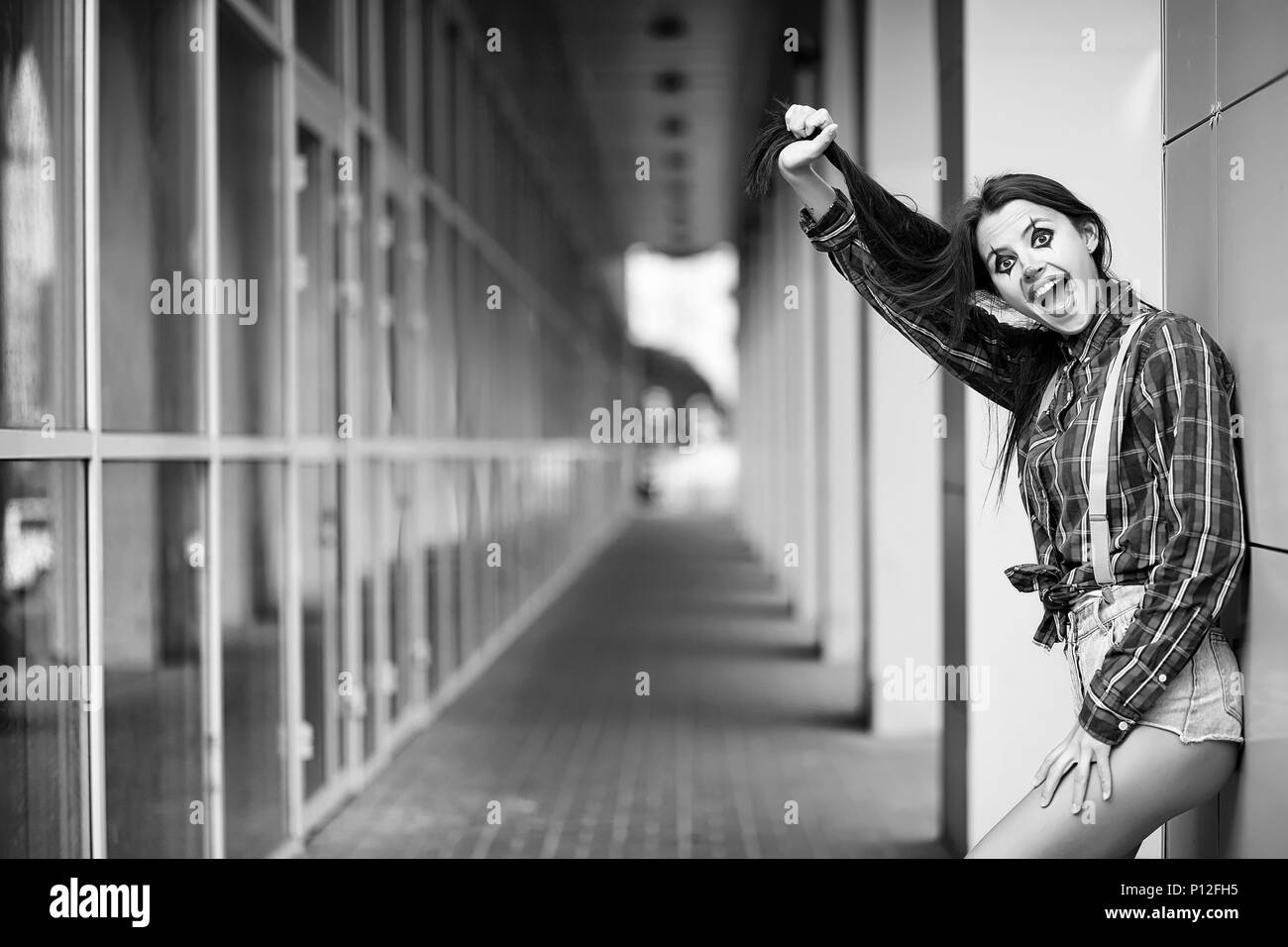 Cute Girl In A Clown Makeup On A Background Black And White Photo