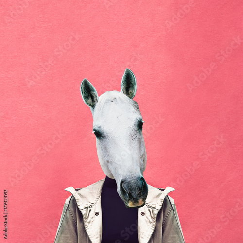 Contemporary Art Collage Man Horse On Pink Wall Background Jeans